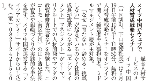 2026年3月12日号の広島経済レポートに、2026年5月19日(火)開催の経営者・人事担当者向け『人材育成戦略セミナー:なぜ「育たない・辞める・挑戦しない」が起きているのか?~社員の成長が成果につながる「エンジョイメント」マネジメント~』(無料・オンライン)が紹介されました。